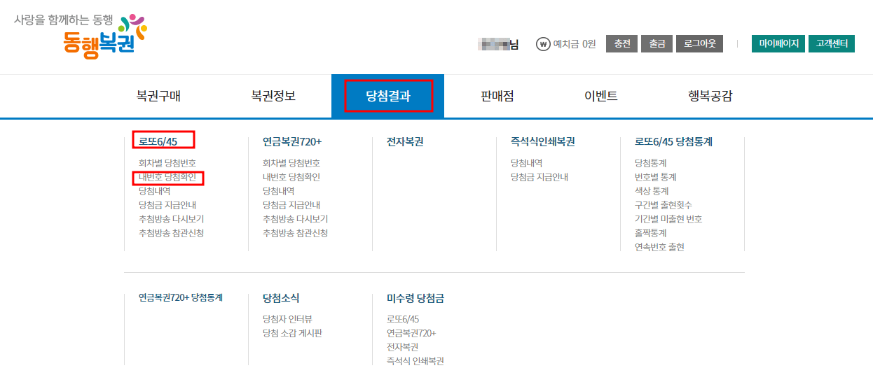 아래 사진처럼 [당첨결과] - [로또 6/45] - [내 번호 당첨확인]을 누르셔도 되고, [마이페이지] - [구매/당첨] 메뉴를 통해서도 바로 당첨여부를 확인할 수 있습니다.