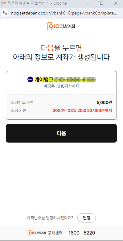 (6) 이제 케이뱅크 계좌(내 핸드폰 번호)로 입금 기한 내에 입금하시면 됩니다.