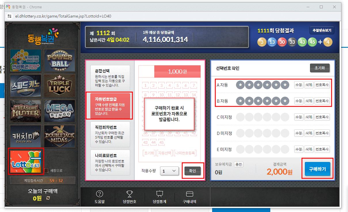 자동으로 로또를 구매할 경우 아래 사진과 같이 "자동번호발급"을 클릭하시고 오른쪽 하단에 "확인"버튼을 누르시면 자동 로또 인터넷 구매가 가능합니다.